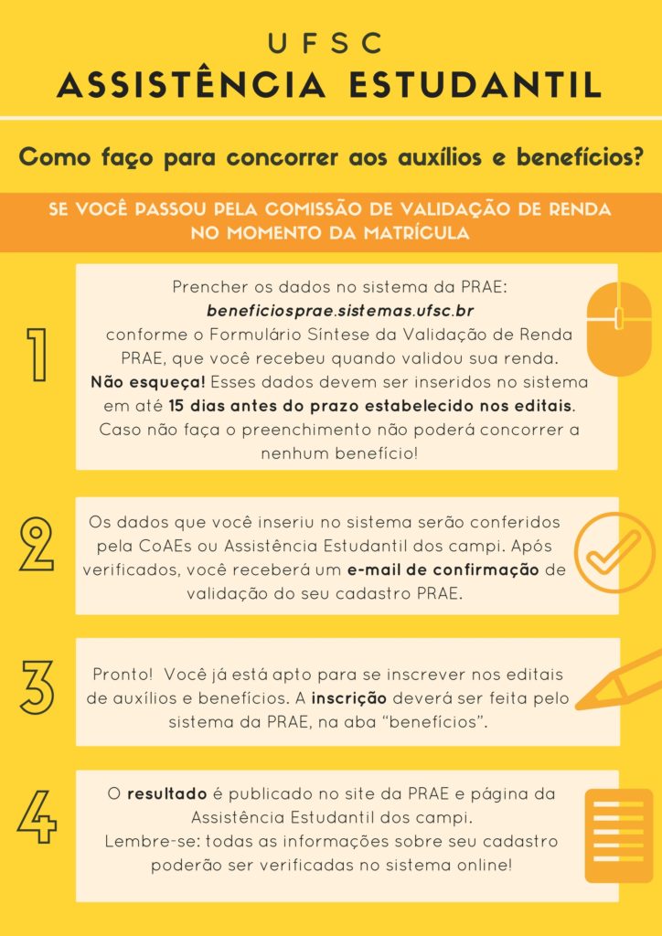 Para mais informações e/ou dúvidas, entrar em contato com a Coordenadoria de Assistência Estudantil – CoAEs, pelos números de telefone (48) 3721-2707 ou 3721-9341.